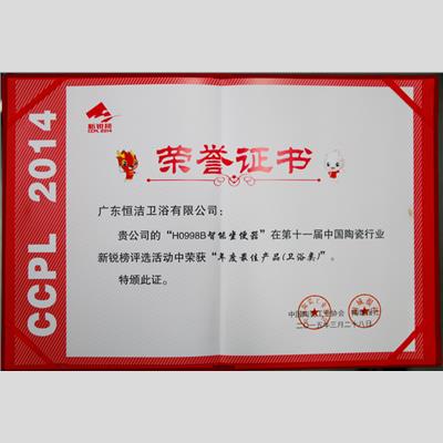 獎 項:第十一屆中國陶瓷行業新銳榜 年度最佳產品(衛浴類)【H0998B智能坐便器】