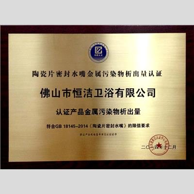 獎(jiǎng) 項(xiàng):陶瓷片密封水嘴金屬污染物析出量認(rèn)證 佛山市恒潔衛(wèi)浴有限公司 認(rèn)證產(chǎn)品金屬污染物析出量 符合GB 18145-2014《陶瓷片密封水嘴》的限值要求